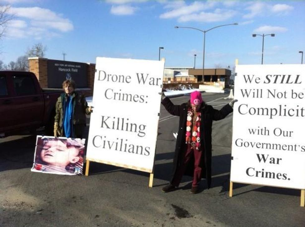 "We come to Hancock Airfield, home of the National Reaper Drone Maintenance and Training Center," they said in their original statement, "to remember the victims of our drone strikes and to ask God's forgiveness for the killing of other human beings, most especially children. The killer drone strikes and the U.S.'s killer drone policies have taken the lives of thousands in a number of countries, such as Afghanistan, Pakistan, Yemen, Iraq and Somalia."