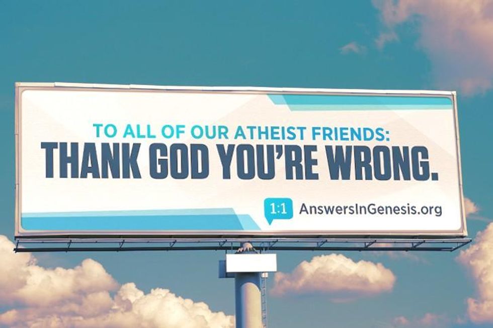 Turns out that Answers in Genesis, an evangelical organization with money to spend, took the God debate to billboards this month in New York and Los Angeles. They were pushing back against a group called the American Atheists, who at Christmas time last year sponsored a billboard featuring images of Jesus and Santa Claus with the words: "Keep the Merry, dump the myth."