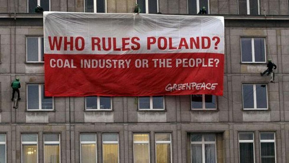 Poland, which gets 80 percent to 90 percent of its power from coal, hosted a parallel conference with the World Coal Association, called the International Coal and Climate Summit. UNFCCC chief Christiana Figueres enraged many climate activists by dignifying the coal conference with a keynote address. Outside the summit, Greenpeace activists in climbing gear hung from the Ministry of Economy with a huge banner, in the red and white of the Polish flag, stating "Who Rules Poland: Coal Industry or the People?" On the roof, others unfurled "Who Rules the World? Fossil Fuel Industry or the People?" On the plaza below, hundreds rallied against coal, arriving in a procession called "Cough 4 Coal" with two huge inflated lungs, signifying the destructive impact of coal on the atmosphere and human health.