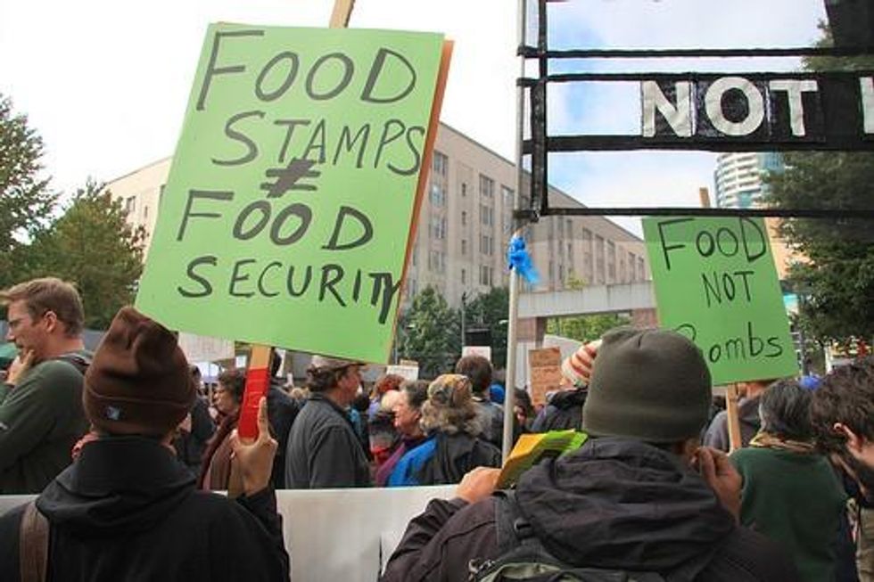 Corporations can't cut wages and say to working people, "There are plenty of hungry people just waiting to take your job, so shut up" if there aren't plenty of hungry people just waiting to take any old nasty, humiliating, low-wage job. So as long as the wealthy few and their giant corporations are able to buy our government we can expect more high unemployment and cuts to programs that help feed people.