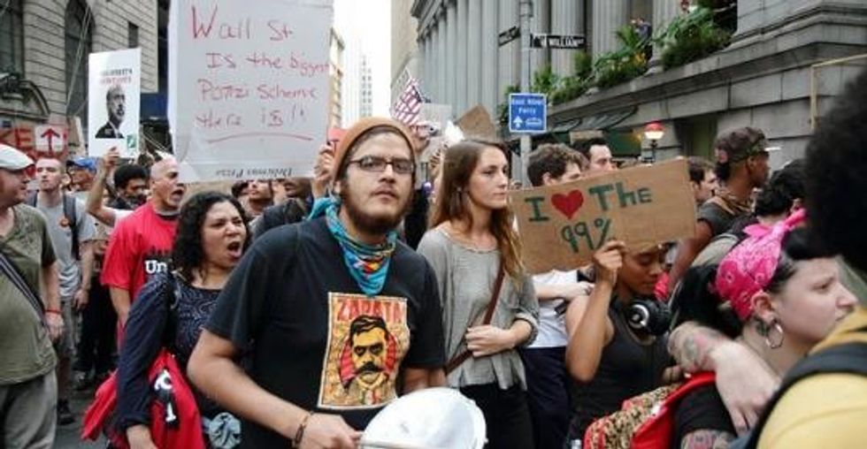 Among the major findings of the study is the overwhelming emphasis of the various Occupy projects on "public communication" rather than particular issue-based campaigns. This is a valuable reminder of the ways in which the dominant nature of Occupy Wall Street was, generally speaking, one of a public performance rather than a platform for long-term organizing. And it was in precisely those terms that it was wildly successful -- "changing the conversation," putting wealth inequality on the discursive map, making "the 99%" and "the 1%" into universally recognized political signifiers.