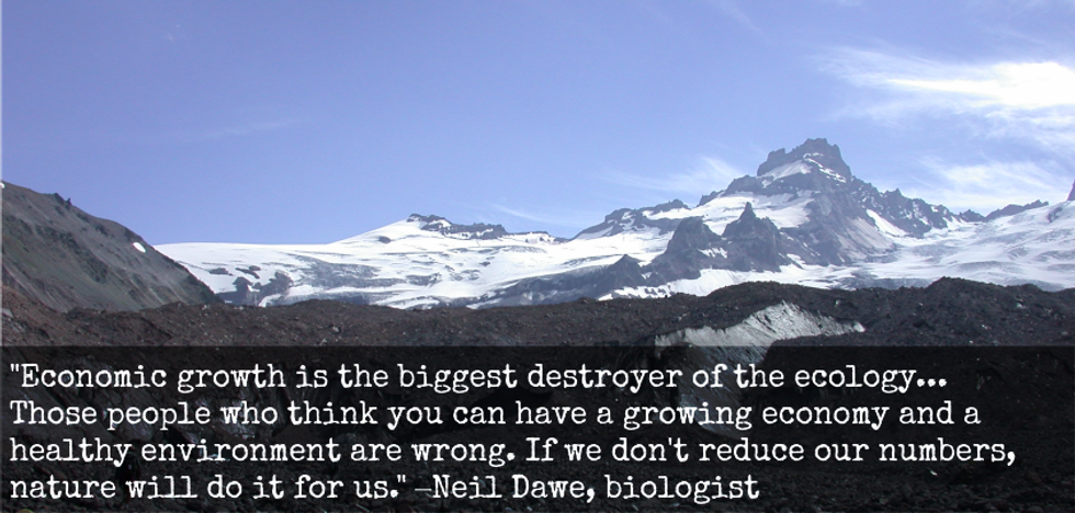 "Economic growth is the biggest destroyer of the ecology... Those people who think you can have a growing economy and a healthy environment are wrong. If we don't reduce our numbers, nature will do it for us." -Neil Dawe, biologist