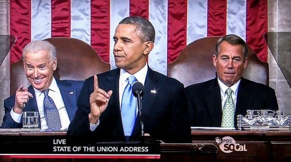 On Iran, Obama reiterated his commitment to the ongoing international negotiations over Iran's nuclear enrichment program -- an effort 60 percent of Americans now support. Directly rebuffing efforts by hawks in Congress to punish Iran even as it cooperates, Obama vowed unambiguously to veto any new Iran sanctions legislation while the parties are still at the table. Obama did give brief credence to the mistaken notion that crippling U.S. sanctions "helped make this opportunity possible" (in reality, Tehran offered Washington a more conciliatory deal over 10 years ago), but his veto threat convinced at least one previous sanctions supporter -- West Virginia Sen. Joe Manchin -- to agree to "give peace a chance."