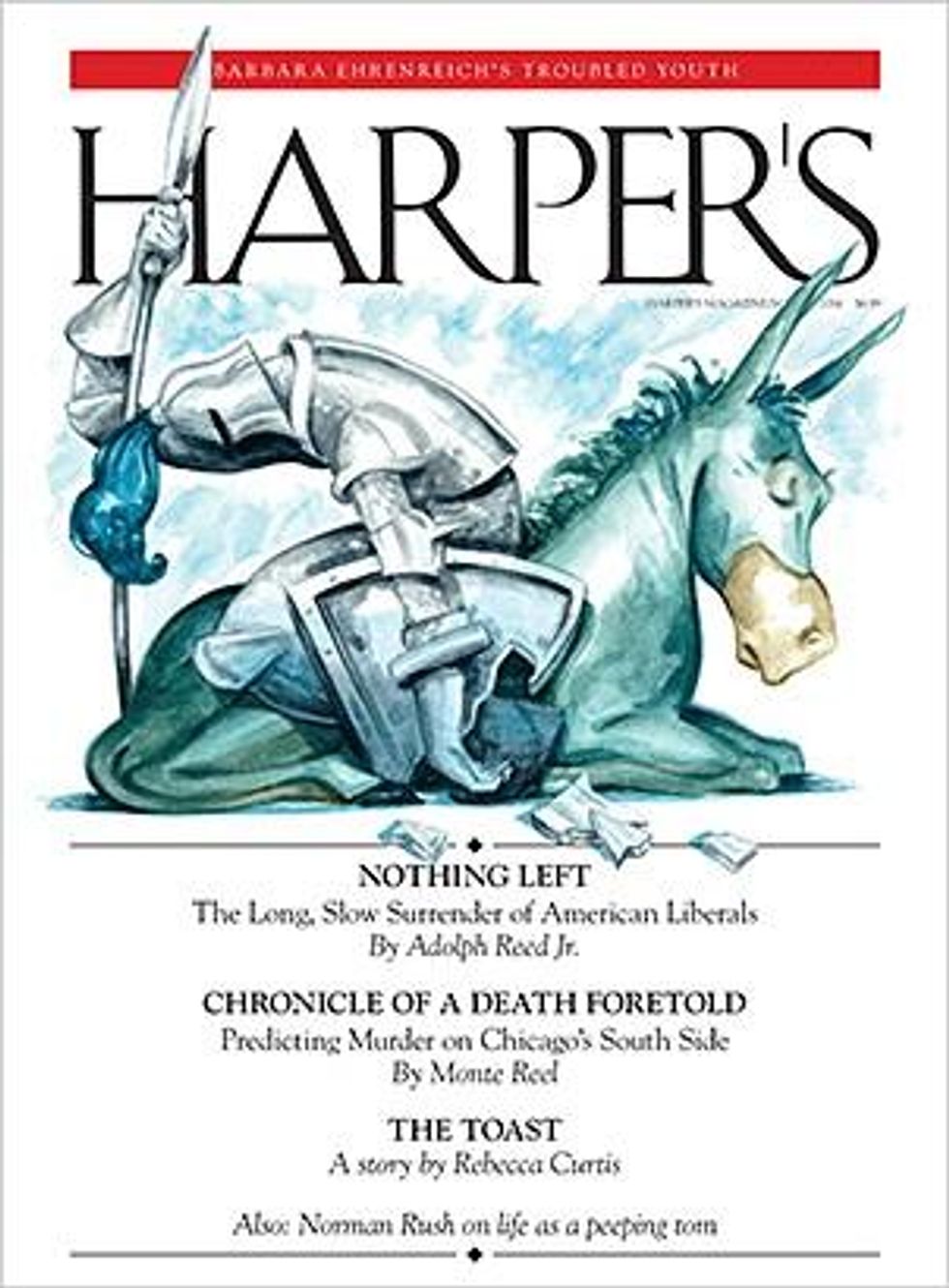 That's a pretty pathetic knight up there on the cover of the March issue of Harper's Magazine. Battered and defeated, his shield in pieces, he's slumped and saddled backwards on a Democratic donkey that has a distinctly woeful -- or bored, maybe -- countenance. It's the magazine's sardonic way of illustrating a powerful throwing down of the gauntlet by political scientist Adolph Reed, Jr. He has challenged the nation's progressives with an article in the magazine provocatively titled "Nothing Left: The Long, Slow Surrender of American Liberals."