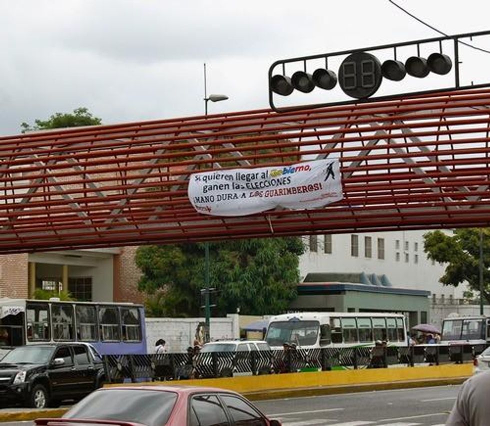 While walking home yesterday, I noticed the banner above that had been draped across a walkover bridge on Sucre Avenue. It reads: "Si quieren llegar al gobierno ganen las elecciones! Mano dura a los guarimberas" (If you want to get to the government win elections! Get tough on organizers of violence!).