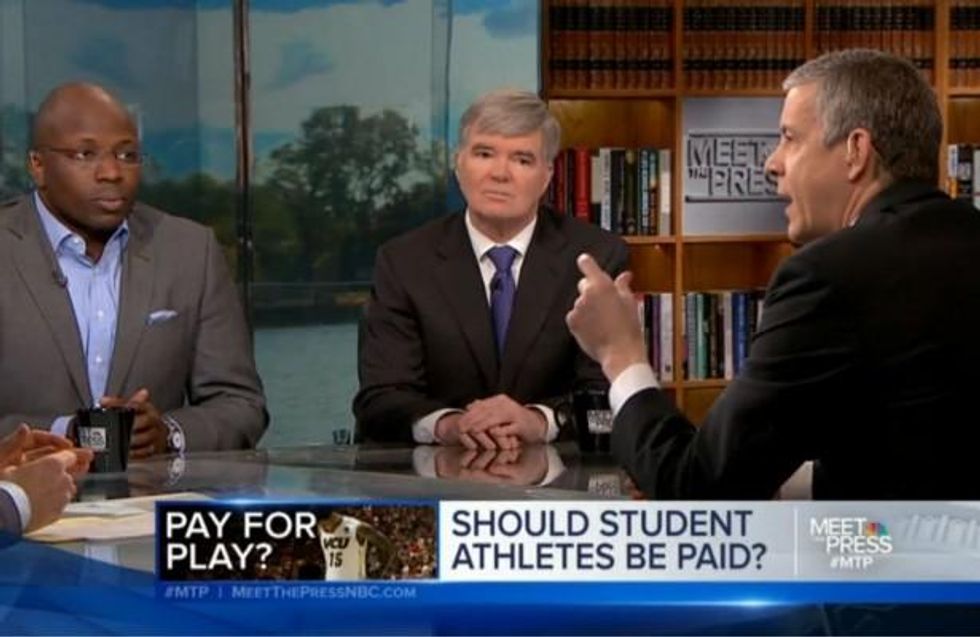 To discuss this issue, Gregory secured three people for the Meet the Press table, including NCAA President Mark Emmert. That's good start! Mark Emmert, is a man who makes a $2 million annual salary defending the status quo. The people Emmert could have been in discussion with is tantalizing. Maybe we would see civil rights author Taylor Branch, whose piece on the NCAA rocked the sports world. Perhaps one of the other guests would be New York Times columnist William Rhoden, whose book $40 Million Slaves examined the social position of African-American athletes. Or we could get USA Today's Christine Brennan, who has written extensively about equity for women in college athletics.