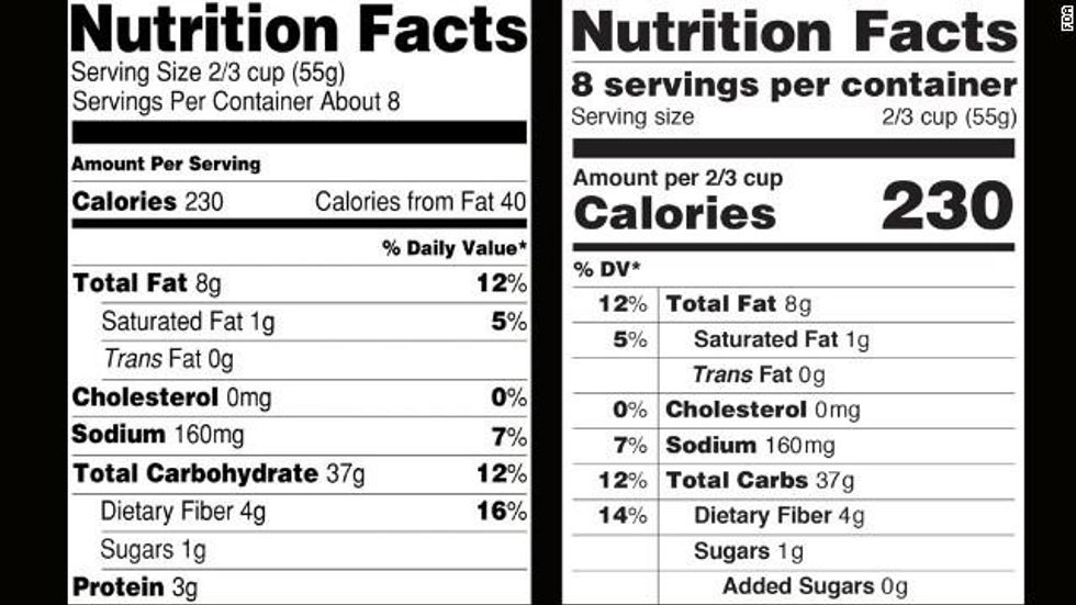 Under the proposed new rules, food manufacturers will be required to list more realistic (as in larger) serving sizes, and display the calorie count in large, bold type. The new labels will also provide a more detailed breakdown of the types of sugar contained in products. And instead of listing vitamins A and C, new labels will list vitamin D and potassium, because, the FDA said, it has evidence that "people are not consuming enough of these nutrients to protect against chronic diseases."