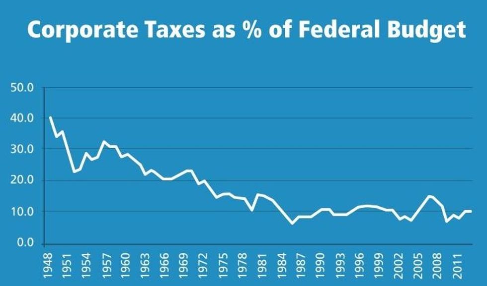 The taxes paid by corporations today are near record lows as a percentage of the United States' total tax bill, even as they are recording massive profits. Yet the unemployment rate is still high.