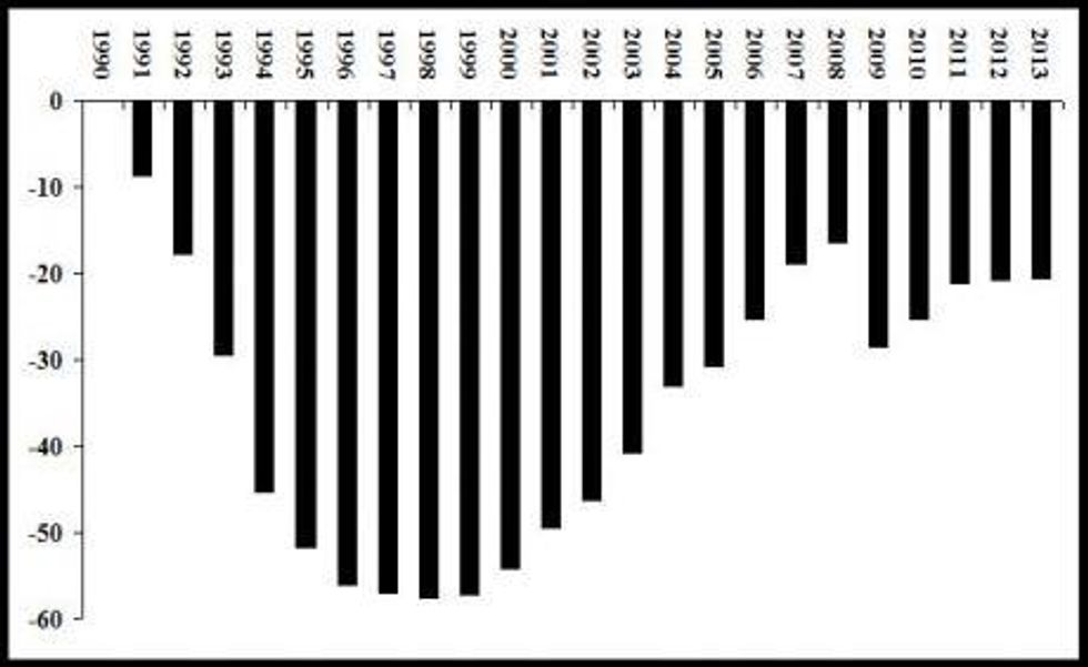 Each former Soviet republic had its transition tragedy. Measured by the fall in per capita income, Ukraine's was the worst except for Georgia that descended into separatist civil conflict after 1990. Income per person in Ukraine fell almost 60% from 1990 to 1997 and did not begin recovery until 2000. At the end of 2013 it remained over 20% below 1990 (see chart below).