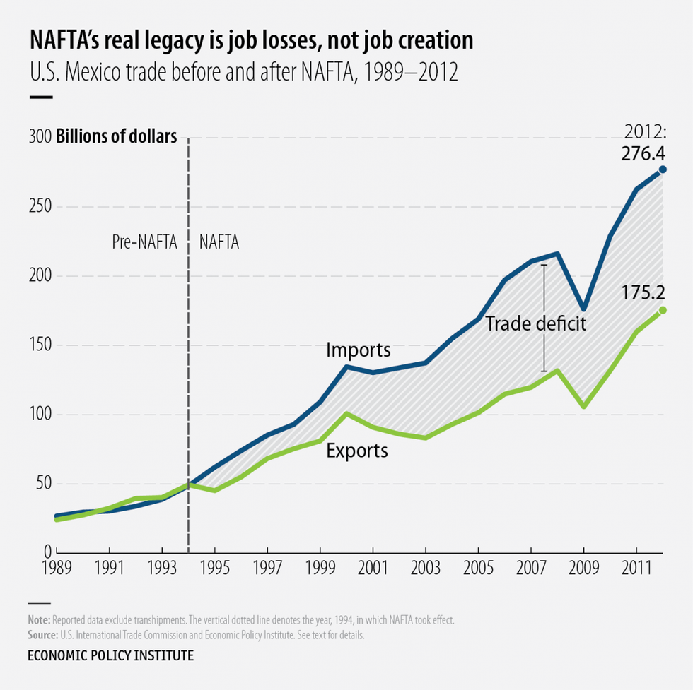 NAFTA - the North American Free Trade Agreement - was sold with promises of jobs and prosperity on all sides of the border. What really happened was that an increased trade deficit sucked demand and jobs out of the U.S. economy; workers lost bargaining power, resulting in pay and benefit cuts; and income inequality rose as corporations pocketed the wage differential.