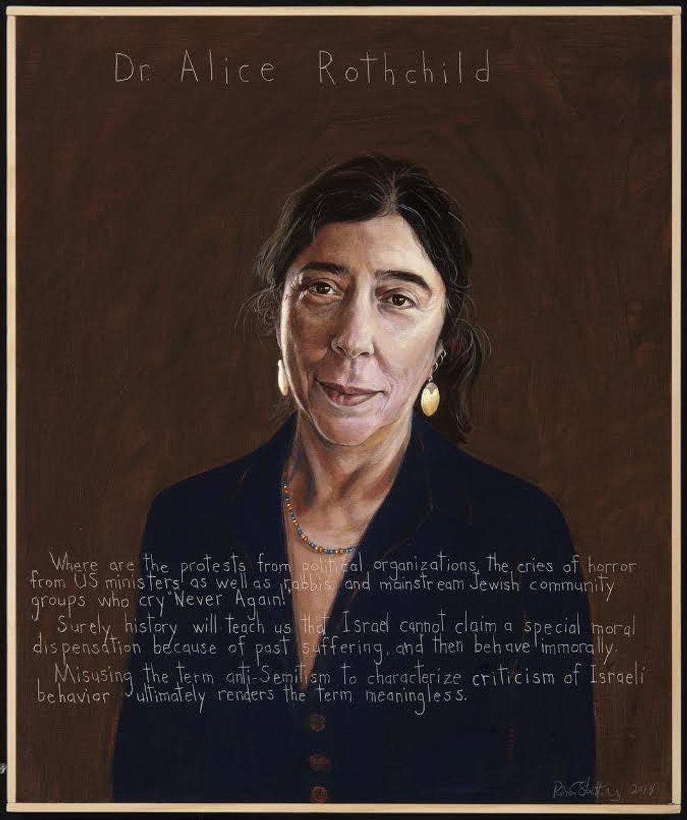 The quote on her portrait says: "Where are the protests from political organizations, the cries of horror from U.S. ministers as well as rabbis and mainstream Jewish community groups who cry 'Never again!' Surely history will teach us that Israel cannot claim a special moral dispensation because of past suffering, and then behave immorally. Misusing the term anti-Semitism to characterize criticism of Israeli behavior ultimately renders the term meaningless."