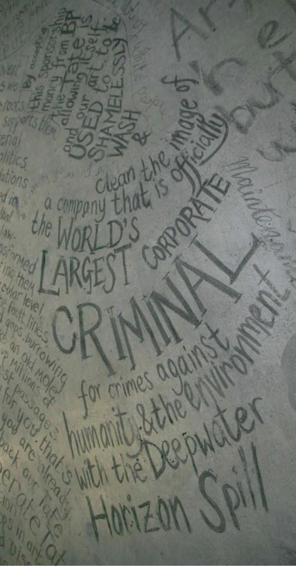 This performance is intentionally challenging for Tate, in its duration and in its direct no-nonsense messaging to visitors, who today read all about BP's horrible history and Tate's shameful support. We see ourselves as part of a wider divestment movement that's growing rapidly. We're calling for cultural divestment, to take away the sheen of respectability the oil industry works so hard to maintain, and without which it would struggle to function. We want Tate to make a choice to value art, artists and culture, over the oil industry which is causing so much harm and doesn't deserve the glint of Tate's shining reputation. This year the tide of the divestment movement is rapidly growing in strength as we move towards the Paris climate talks this December. Tate could give the movement a great big extra shove if dropped its support for BP. We believe its making the decision on whether to continue the deal past 2016 right now, and we hope the overwhelming public support we received from the visiting public for our performance today will help to sway its decision.