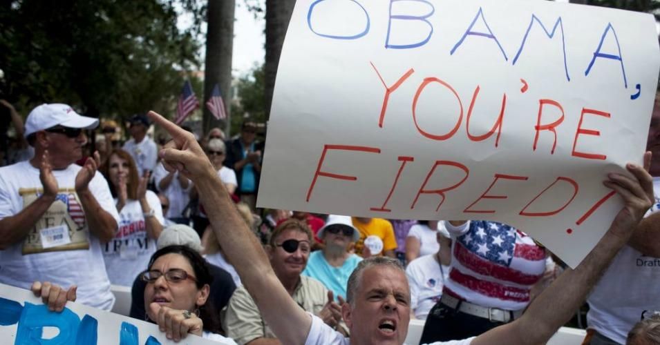 From left, Fatima Berrahal and Educardo Burkhart, of West Palm Beach, listen to billionaire Donald Trump as he addresses a crowd at the 2011 Palm Beach County Tax Day Tea Party on April 16, 2011 at Sanborn Square in Boca Raton, Florida. (Photo by John W. Adkisson/Getty Images)