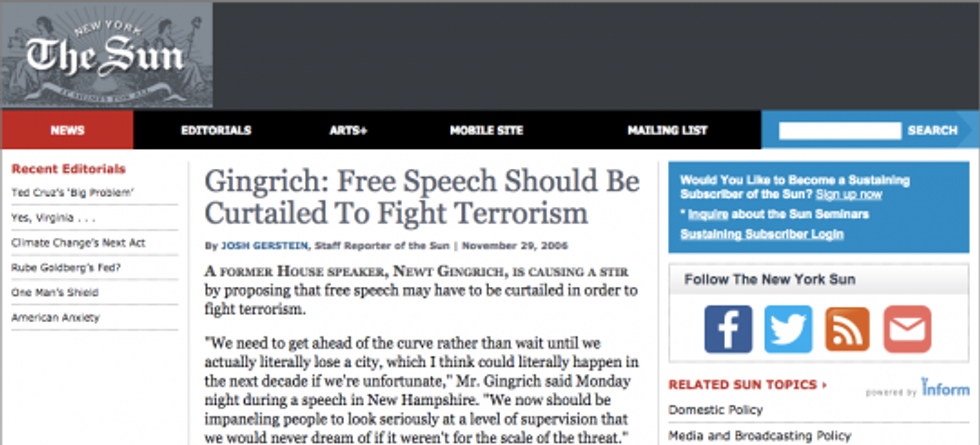 In 2006 - years before ISIS replaced Al Qaeda as the New and Unprecedentedly Evil Villain - Newt Gingrich gave a speech in New Hampshire in which, as he put it afterward, he "called for a serious debate about the First Amendment and how terrorists are abusing our rights-using them as they once used passenger jets-to threaten and kill Americans." In that speech, Gingrich argued: