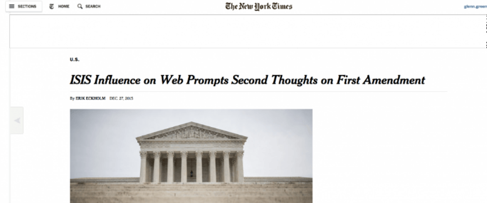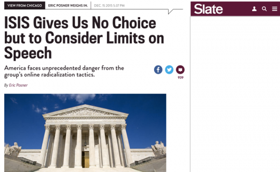 The NYT cites two recent articles, one in Bloomberg by long-time Obama adviser Cass Sunstein and the other in Slate by Law Professor Eric Posner, that suggested limitations on the First Amendment in order to fight ISIS. It describes growing calls to ban the YouTube lectures and sermons of Anwar al-Awlaki, the American cleric whom the U.S. assassinated by drone in 2011 (and then, two weeks later, killed his 16-year-old American son). It also notes that the desire to restrict the internet as a means of fighting ISIS has seeped into the leadership of both parties: Donald Trump said the "internet should be closed up" to ISIS, while "Hillary Clinton said the government should work with host companies to shut jihadist websites and chat rooms," a plan that would be unconstitutional "if the government exerted pressure on private firms to cooperate in censorship."