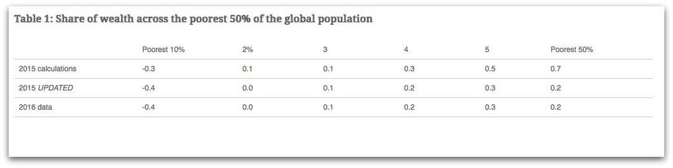 'In January 2014, Oxfam calculated that just 85 people had the same amount of wealth as the bottom half of humanity. This was based on data on the net wealth of the richest individuals from Forbes and data on the global wealth distribution from Credit Suisse. For the past three years, we have been tracking these data sources to understand how the global wealth distribution is evolving. In the Credit Suisse report of October 2015, the richest 1% had the same amount of wealth as the other 99%.