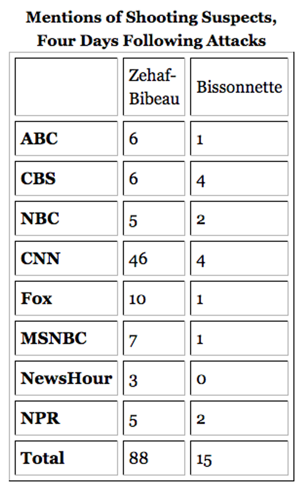 Every outlet we checked had more coverage of Zehaf-Bibeau than of Bissonnette--ranging from 50 percent more stories on CBS to more than 11 times as many stories on CNN. (The PBS NewsHour, which ran three stories referencing Zehaf-Bibeau, did not run any stories on Bissonnette.) Mostly these outlets ran one or two stories talking about the mosque attack suspect, versus 5-7 stories with the parliament attacker. All in all, there were 88 Zehaf-Bibeau stories and 15 Bissonnette stories--a ratio of about 6 to 1.