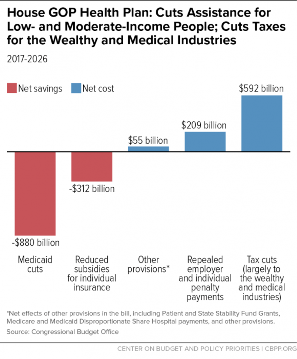 This sleight of hand matters not only for budget rules. It also avoids the appearance that Republicans are cutting Medicaid to finance corporate tax rate cuts. Yet the maneuvering does not change the consequences of these policies: House Republican leaders' cuts to Medicaid and other health coverage provisions will leave 24 million more people uninsured, and most of the proceeds from these cutbacks will be used to finance billions of dollars in tax cuts for the wealthy in the health legislation and, ultimately, to make possible deeper tax cuts for large, profitable corporations.