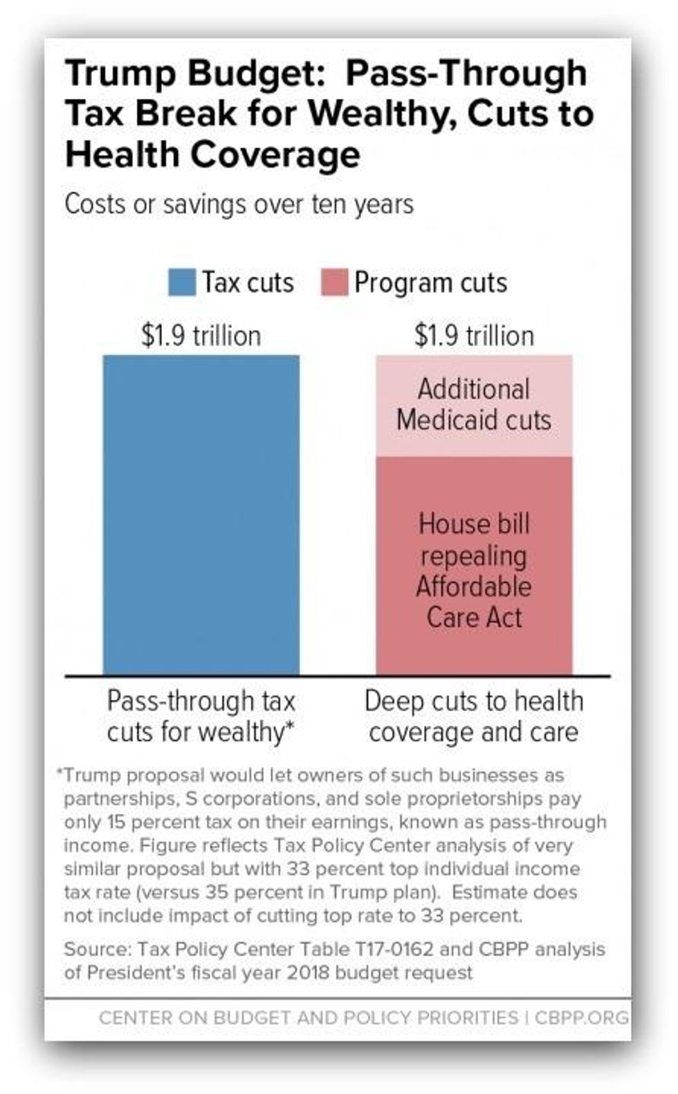 We've explained that President Trump's 2018 budget is the most radical, Robin-Hood-in-reverse budget that any modern President has ever proposed, and here's a perfect illustration: it cuts health coverage and care for poor and modest-income families by nearly $2 trillion over ten years, while giving high-income people a nearly $2 trillion tax break on "pass-through" business income. More than 20 million Americans would lose health coverage, even as the 400 highest-income taxpayers -- whose annual incomes average more than $300 million -- would get tax cuts averaging around $9 million apiece each year.