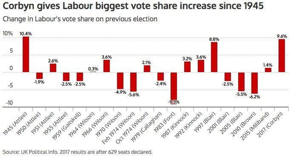 It shows that he has just won the largest increase in the share of the Labour vote over the party's previous general election performance since Clement Attlee in 1945. In short, Corbyn's turned around the electoral fortunes of the Labour party more than any other party leader in 70 years.