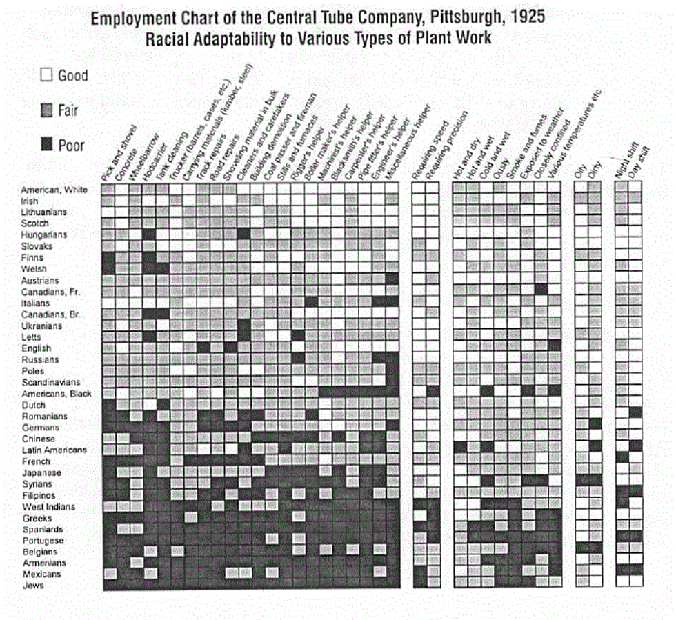 This hiring chart was created for the management of a Pittsburgh steel company in 1925 based on what was considered at the time to be the most advanced "race science." (From John E. Bodnar, Roger Simon and Michael P. Weber, Lives of Their Own: Blacks, Italians, and Poles in Pittsburgh, 1900-1960.)