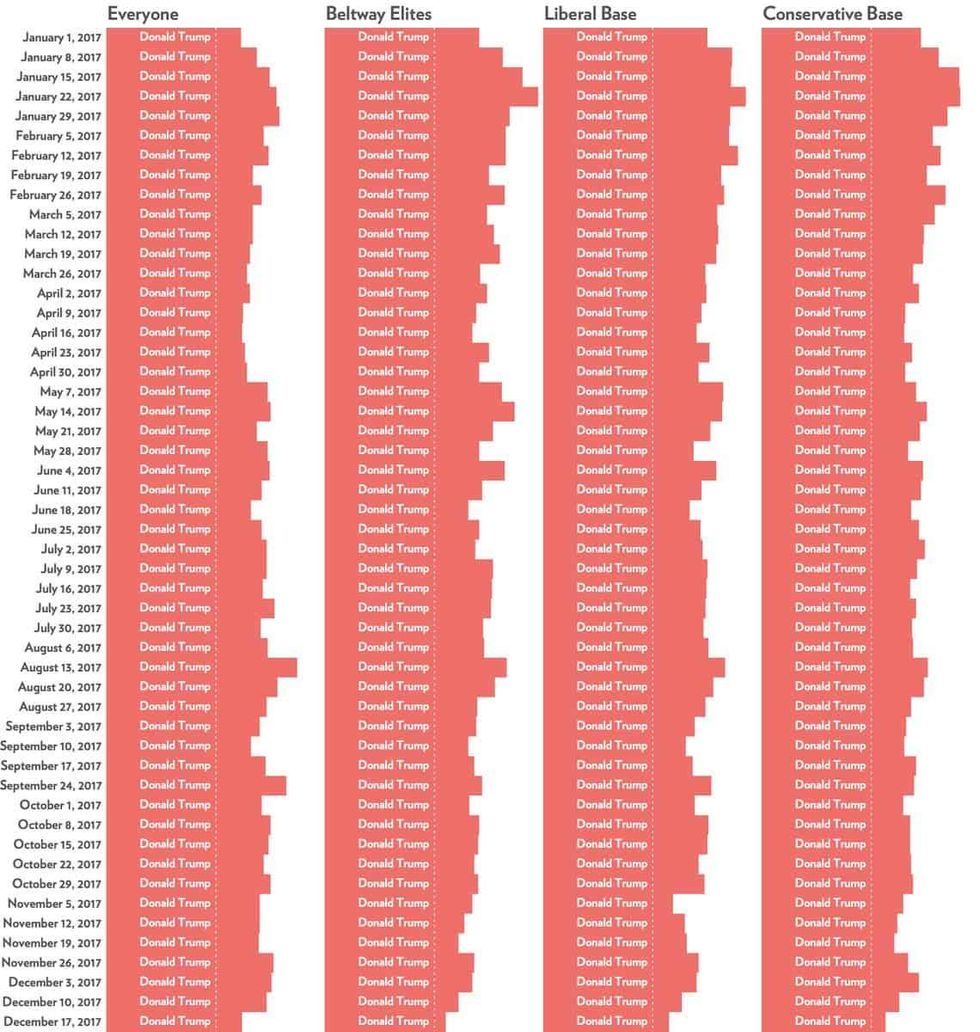 We should be talking about our economic future, but all we're talking about our 45th president. Look at this chart, which shows the top story on social media accounts by social category for the first year (more or less) of Trump's presidency: