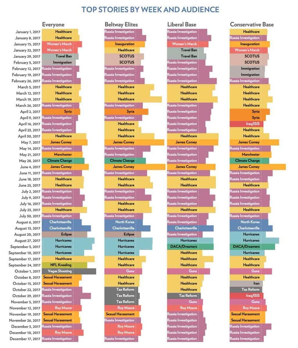 Two stories seem to have staying power across all four categories: the Russia investigation, and healthcare. One of those stories involves Trump and the people around him, but doesn't address the issues that affect people's day-to-day lives. The other affects their lives - and sometimes deaths - directly.
