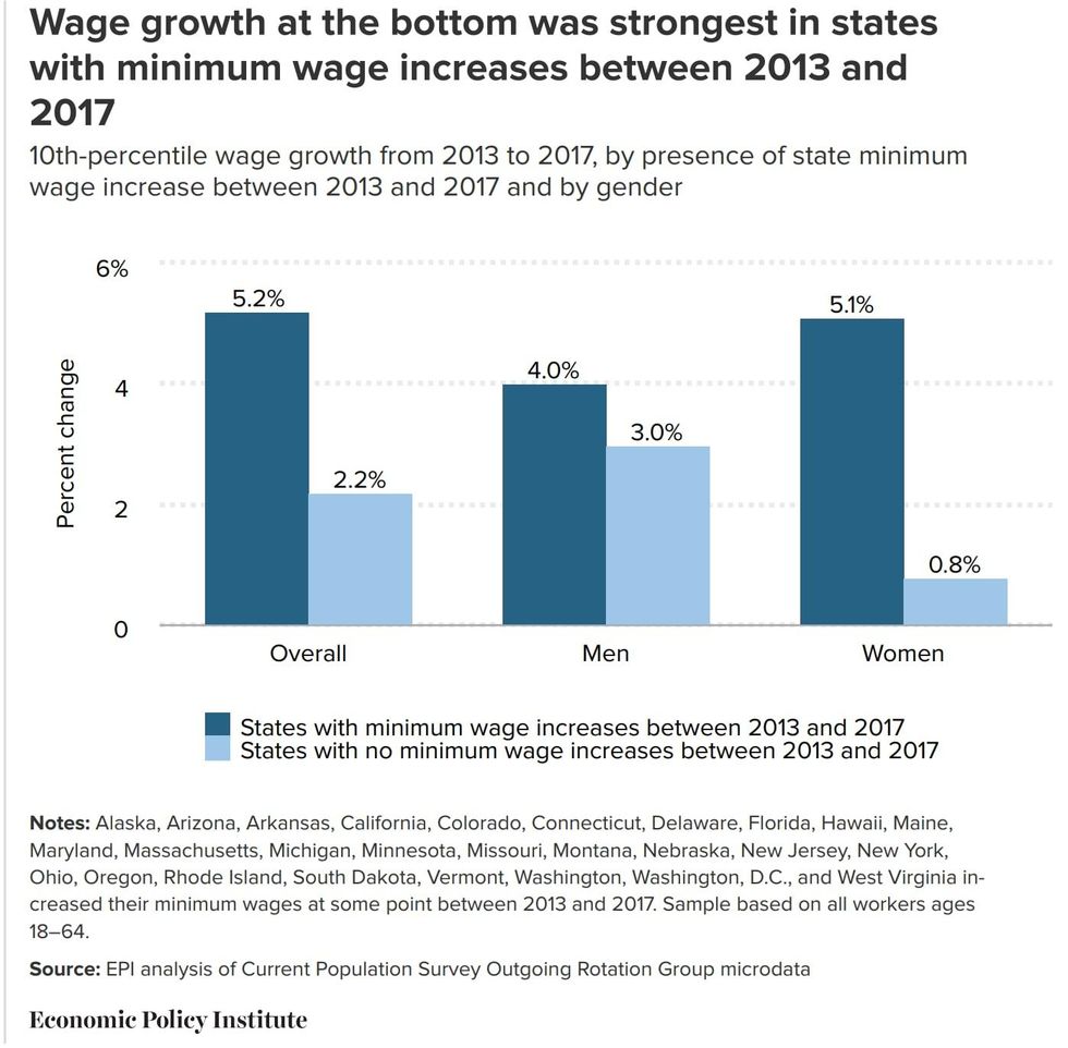That's not to say no one ever loses a job or hours of work due to higher wage floors. Nor is it to say that a minimum wage of any level could be handily absorbed, even in low-wage states. But any debate over this policy should be informed by results like the ones shown here, and should ignore claims that the policy generates nothing but negative, unintended consequences.