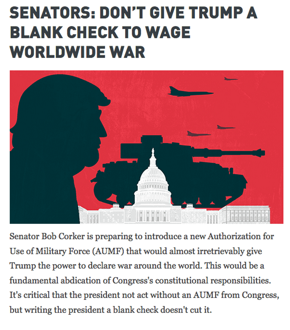 It would be hard to overstate the depth and breadth of our concern about this new AUMF as it has been described in reports. The resolution sponsored by Sen. Bob Corker (R-Tenn.) would almost irretrievably cede to the president the most fundamental power that Congress has under Article I of the Constitution: the power to declare war. It would give the executive branch the sole authority to send American troops to countries where we are not currently at war and to use military force against groups that the president alone decides are enemies. The resolution would reportedly have no restrictions against using lethal force anywhere, whether missile attacks or American troops on the ground.