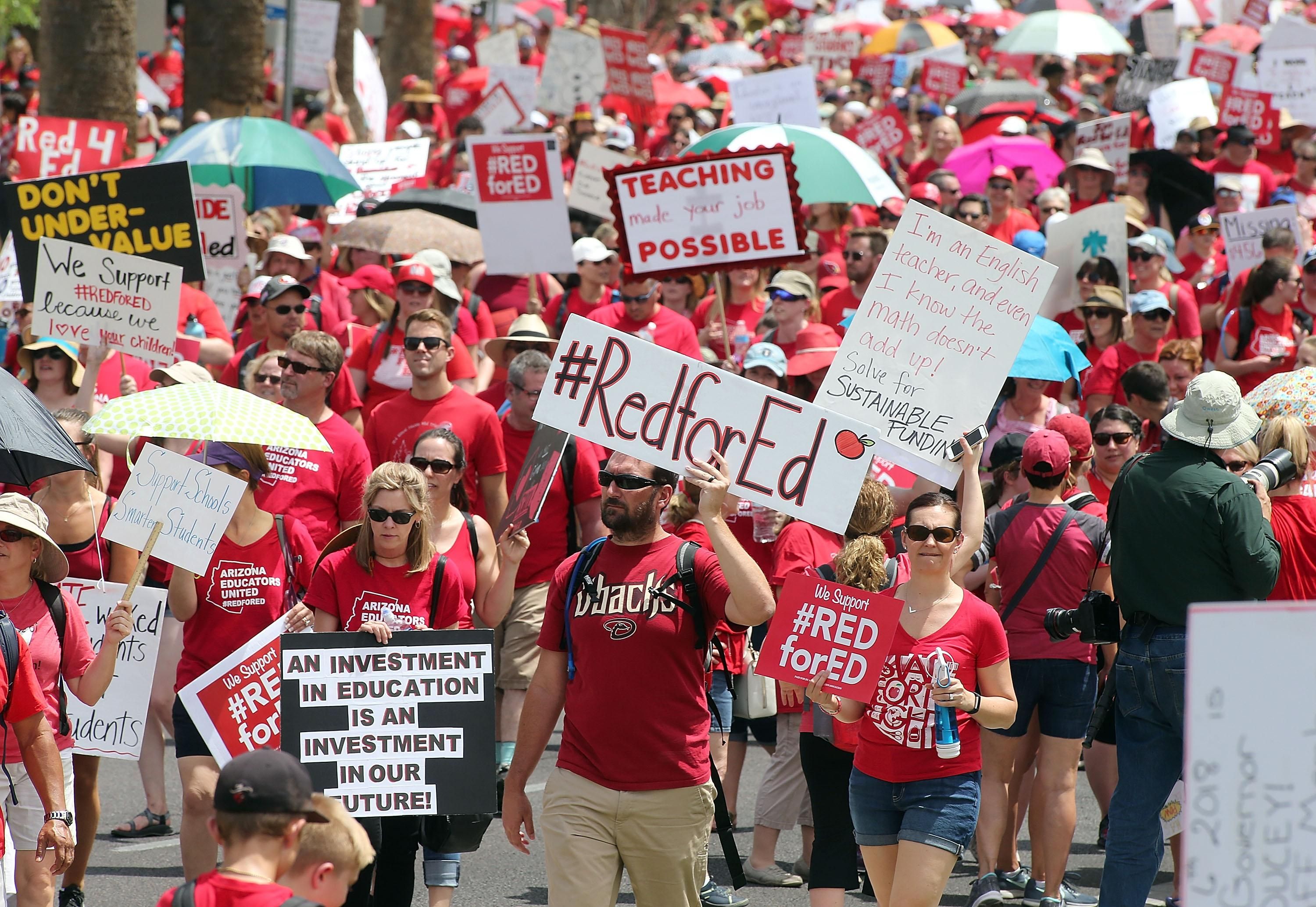 Arizona teachers march toward the State Capitol as part of a rally for the #REDforED movement on April 26, 2018 in Phoenix, Arizona. Teachers state-wide staged a walkout strike on Thursday in support of better wages and state funding for public schools. (Photo: Ralph Freso/Getty Images)