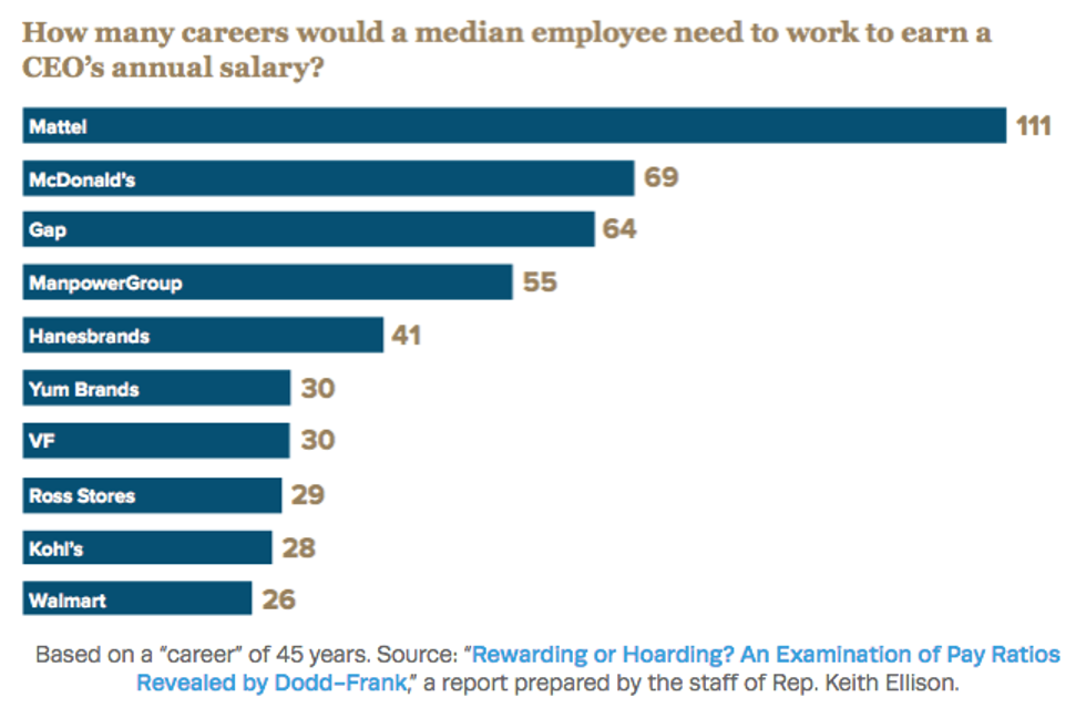 The staff of Rep. Keith Ellison has just released a report looking at the first 225 companies in the Fortune 500 to disclose their pay gaps. The average CEO-to-worker pay ratio among these firms was 339 to 1, and the widest gap was toymaker Mattel's, at an astounding 4,987 to 1.