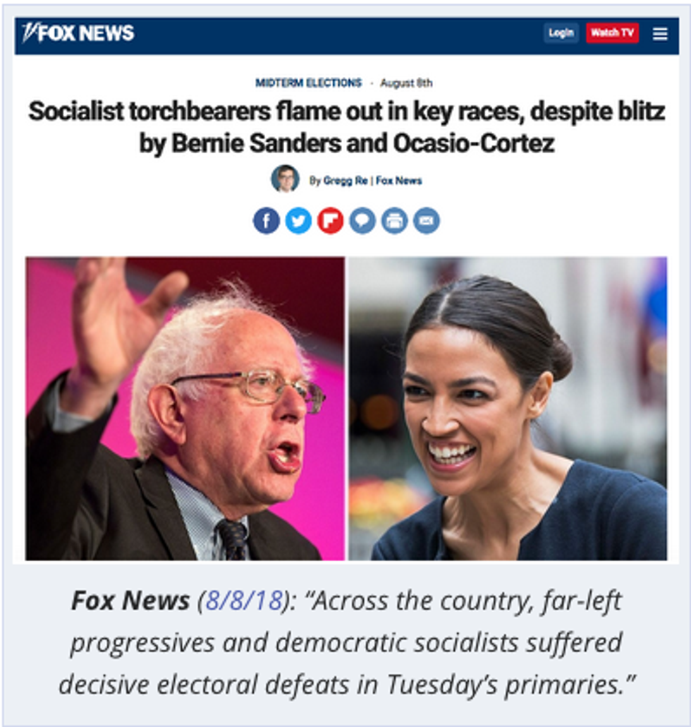 Michelle Goldberg of the New York Times (8/9/18), perhaps the only person in the right-leaning Times op-ed lineup who could be considered sympathetic to Sanders' politics, noted that while insurgent candidates might not have won every primary, the left wing of the Democratic party was nonetheless winning hard-fought victories on the strength of its ideology and electoral pragmatism. Whether left-leaning Democrats fall flat in the midterms or not, their ideas have persuaded America that socialism is a legitimate and popular political movement, and will likely be a strong voting bloc in the next Congress. Whether corporate media choose to acknowledge its relevance or continue its fear-mongering remains to be seen.