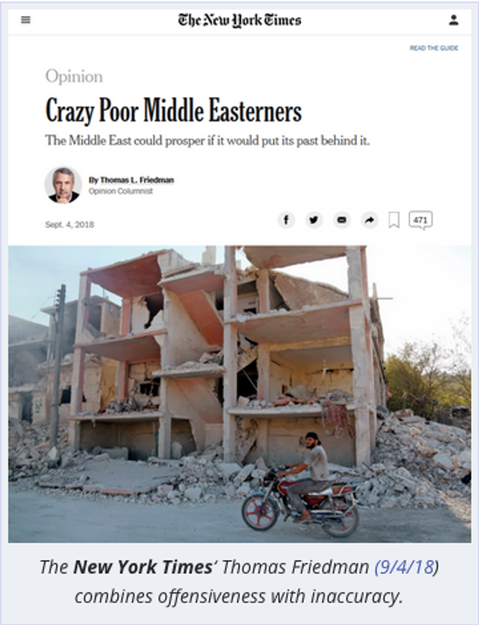 Thomas Friedman (New York Times, 9/4/18) went to the movies and his takeaway from seeing Crazy Rich Asians is that if they made a film about the Middle East, it could be called Crazy Poor Middle Easterners: