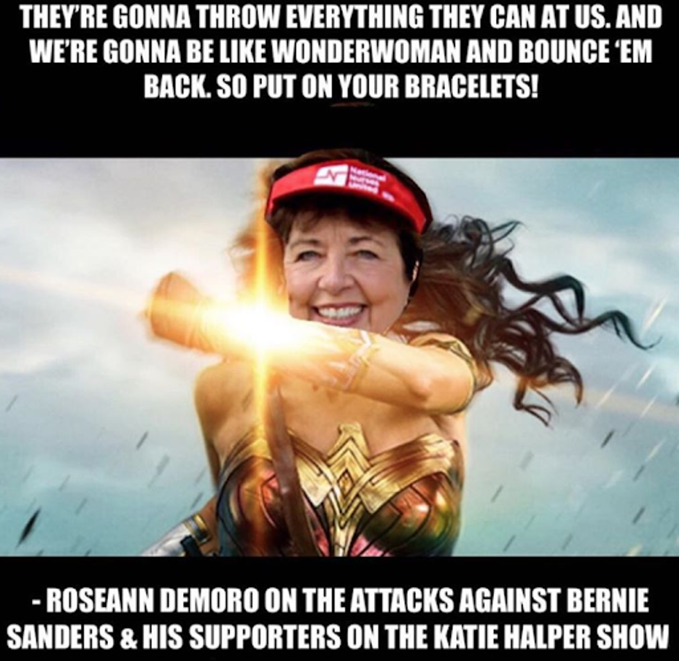 An ardent supporter for Sanders to run again in 2020, DeMoro is prepared for more of the smears which started in 2016 and never really went away. "They're gonna throw everything at us, when it comes to Bernie, and we're gonna be like Wonder Woman and bounce 'em right back. So put on your bracelets."