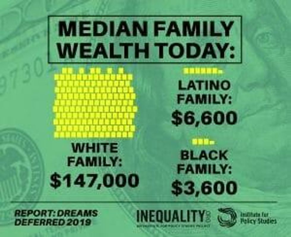 - If the trajectory of the past three decades continues, by 2050 the median White family will have $174,000 of wealth, while Latino median wealth will be $8,600 and Black median wealth will be $600. The median Black family is on track to reach zero wealth by 2082.