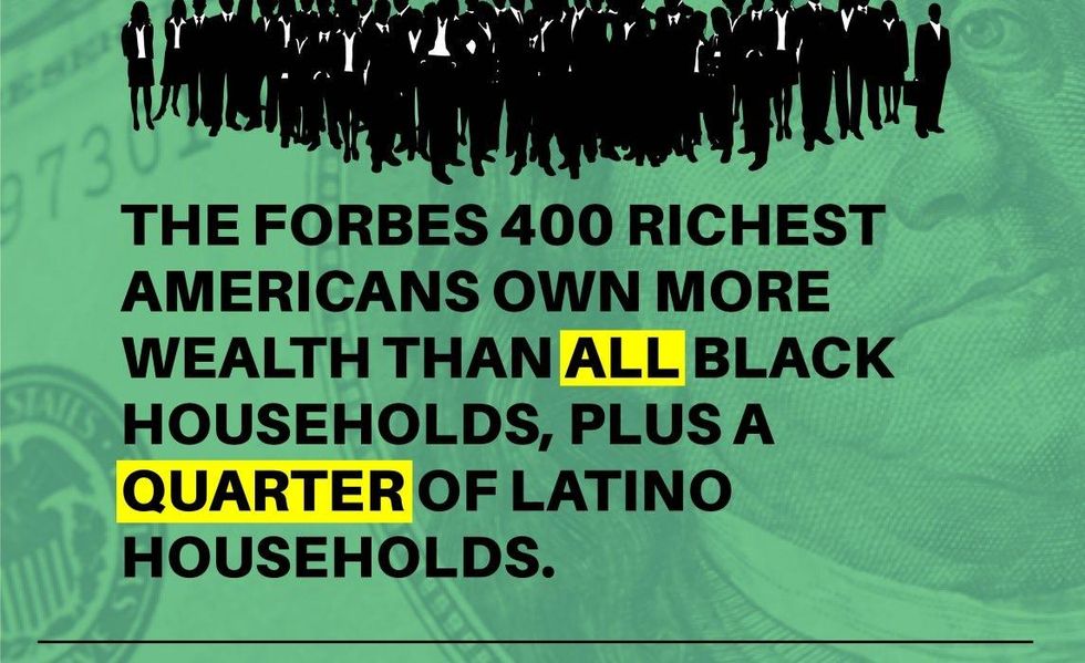 - The Forbes 400 richest Americans own more wealth than all Black households plus a quarter of Latino households.