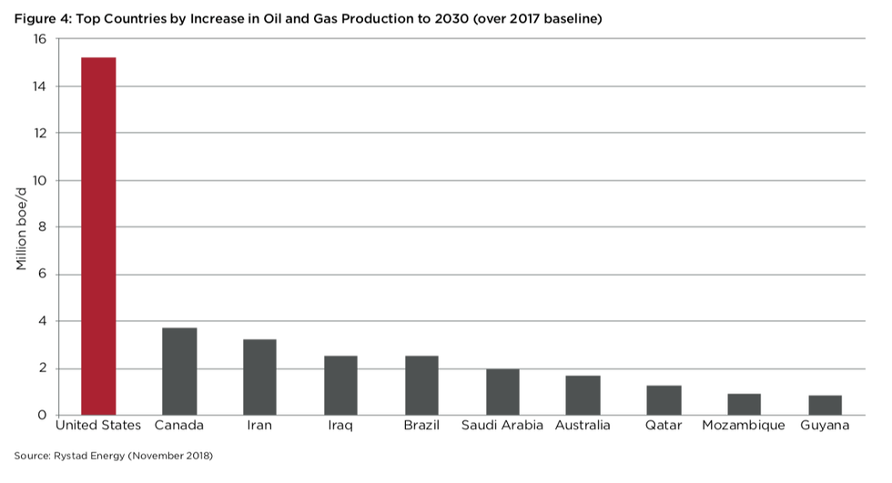 Our analysis shows that the United States is set to drive nearly 60 percent of global growth in oil and gas supply between now and 2030 - expanding production by four times the amount of any other country (Figure 4). By contrast, the Intergovernmental Panel on Climate Change (IPCC)'s recent Special Report on 1.5degC of Global Warming warns that the world needs to cut carbon emissions nearly in half by 2030 to keep warming within that limit.