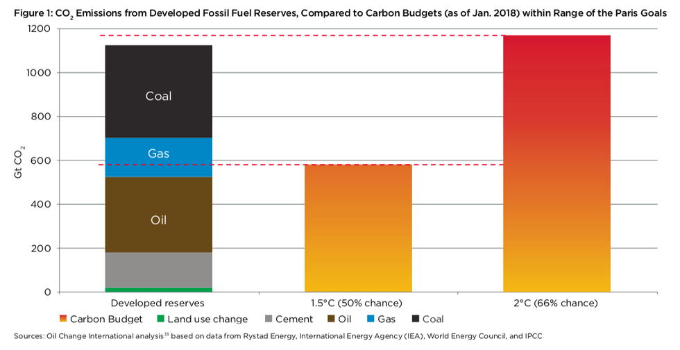 Previous analysis of the global disconnect between fossil fuel industry plans and climate goals underlies our U.S. report. Existing oil and gas fields and coal mines around the world already contain enough carbon to push the world beyond the goals of the Paris Agreement - and well beyond 1.5 degrees Celsius (degC) of temperature rise (Figure 1). There is already no room for new fossil fuel development anywhere in the world. Meeting the Paris Agreement goals requires stopping new exploration and extraction projects and managing the decline of the fossil fuel industry over the next few decades.