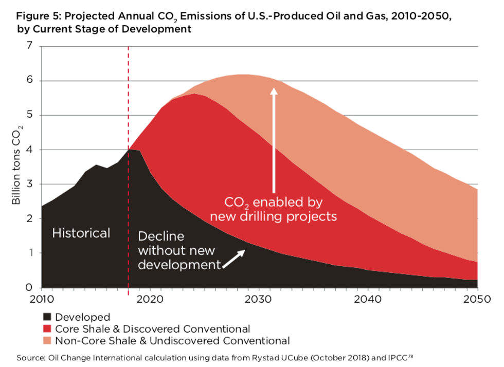 Between 2018 and 2050 - the timespan over which fossil fuel emissions should be zeroing out - new U.S. drilling projects could unleash 120 billion tons of new carbon pollution (Figure 5). If left unchecked, this would amount to the world's largest burst of new carbon emissions from oil and gas development through 2050. It would be equivalent to the lifetime carbon pollution of nearly 1,000 average U.S. coal-fired power plants.