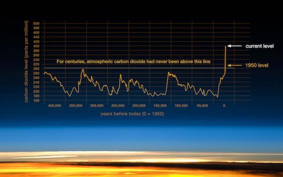 What Exxon-Mobil and Saudi Arabia don't want you to notice is that spike on the chart at the far right. That's us, folks. This amount of CO2 hasn't been seen by the earth during the past 400,000 years. We Homo Sapiens only evolved about 200,000 years ago, so we've set it up to be way hotter than it has ever been all the time we've existed. We know we've been a successful species during the low-carbon era. We don't know whether we can adapt to this new world we are rapidly creating.