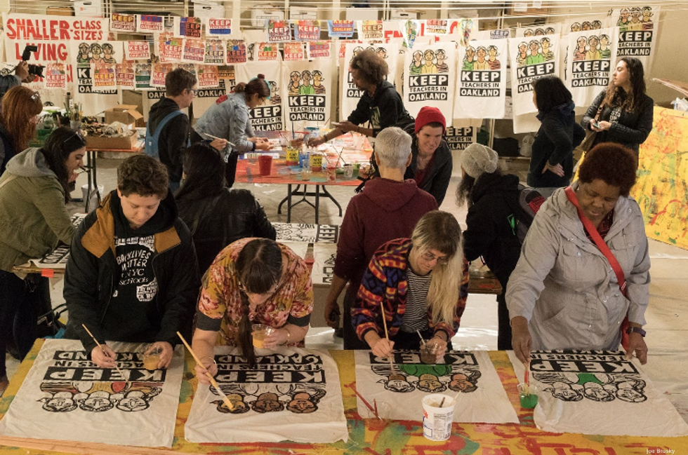 Surrounded by a hundred teachers and supporters painting banners, screen printing fabric picket flags, and learning strike songs, Oakland teachers union president Keith Brown held a press conference announced that Oakland teachers would hold a strike vote. Every square inch of the union hall offices and parking garage was filled with people making art and singing strike songs. This is one key part of how Oakland teachers built momentum and got ready to strike. The victorious Los Angeles teachers strike last month held a similar pre-strike arts mobilization. Teacher and union arts organizer Joe Brusky says, "the art created for L.A. played a major role in winning a victory."