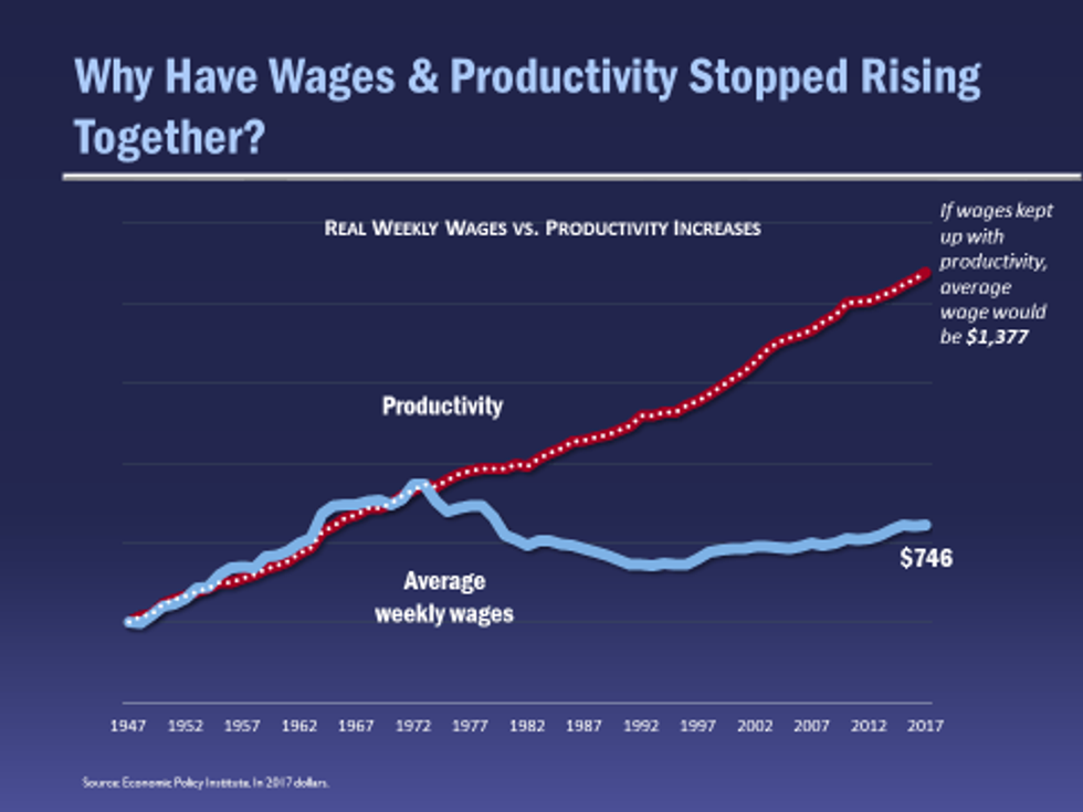 After the late 1970s, however, the story changes dramatically. Real wages stall for more than 40 years, while productivity continues to climb. Had wages and productivity continued to rise in tandem, the average weekly earnings of the American worker would be almost double what it is today, rising from today's average of $746 per week to $1,377 per week.