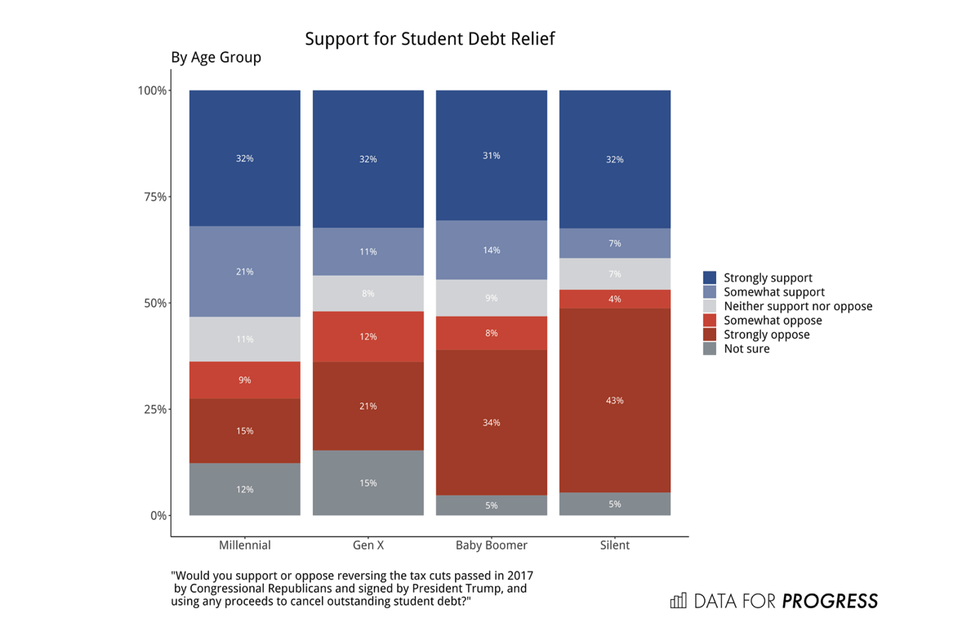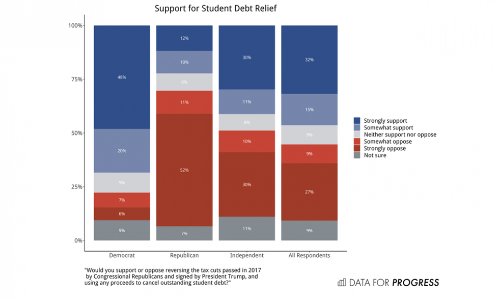Earlier this year, Freedom to Prosper and Data for Progress fielded a nationally representative survey analyzing support for repealing Trump's tax cuts and using the proceeds to cancel outstanding student debt. Across the full sample, 47 percent of respondents supported and 36 percent of respondents opposed the proposal. Contrary to Republicans' hopes, not only are Trump's corporate tax handouts unpopular generally, but they are especially so when voters are given the chance to cancel them in favor of a major national debt cancellation program.