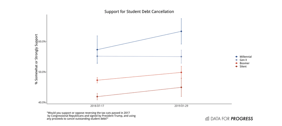 First, the change in overall opinion is likely driven by Millennials, who are growing as a share of the electorate and are the voters most directly affected by the burden of student loans. Their mean level of support for student debt relief rose by six points from July 2018 to January 2019.