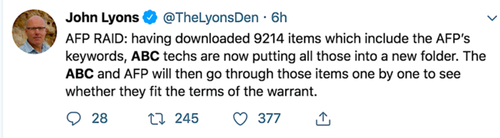 "This is a serious development and raises legitimate concerns over freedom of the press and proper public scrutiny of national security and Defence matters," he said. "The ABC stands by its journalists, will protect its sources and continue to report without fear or favour on national security and intelligence issues when there is a clear public interest." John Lyons, ABC's executive editor and head of investigative journalism, tweeted: