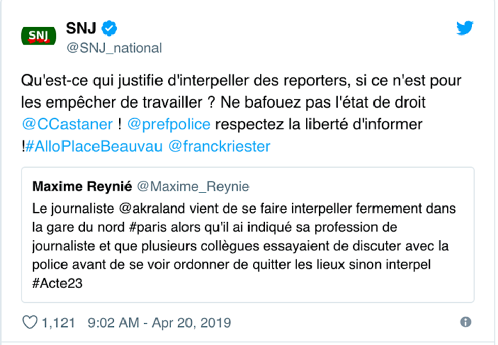 Assange was arrested in London on April 11. Police in Paris arrested two journalists who were covering Yellow Vest protests on April 20. One of the journalists, Alexis Kraland, said he was taken into custody after refusing to be searched and to turn his camera over to police at Gare du Nord train station. The largest journalism union in France demanded an explanation from police.