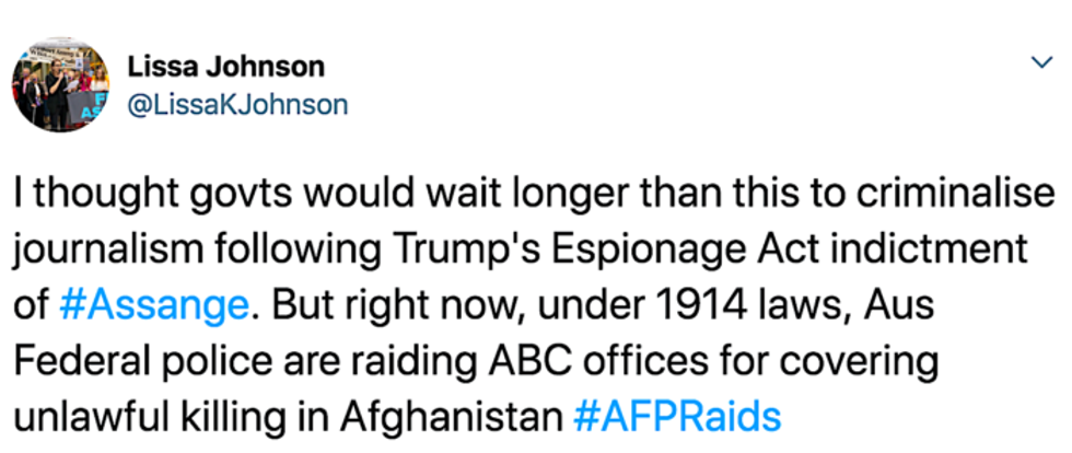 "It should chill the public as well as journalists," he said. "These raids are all about intimidating journalists and intimidating whistle blowers so that mistakes made by the Government, including potential crimes, by the military, remain covered up, remain secret, and don't fall in to the public domain."