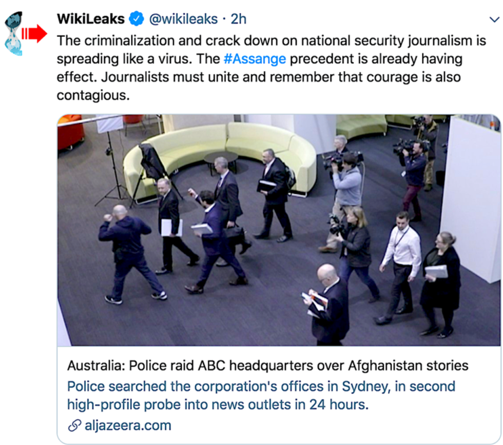 While there is no direct connection between Assange's arrest and indictment for possessing and disseminating classified material and these subsequent police actions, a Western taboo on arresting or prosecuting the press for its work has clearly been weakened. One must ask why Australian police acted on a broadcast produced in 2017 and an article published in April only after Assange's arrest and prosecution.