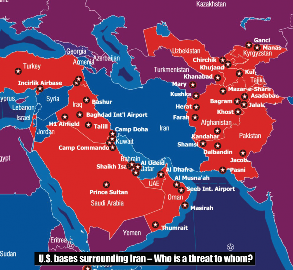 The U.S. government claims it is threatened by Iran. Yet, according to David Stockman writing in Antiwar.com, the United States surrounds Iran with forty-five U.S. bases, and Iran's defense budget of less than $15 billion amounts to just seven days of money spent by the Pentagon.