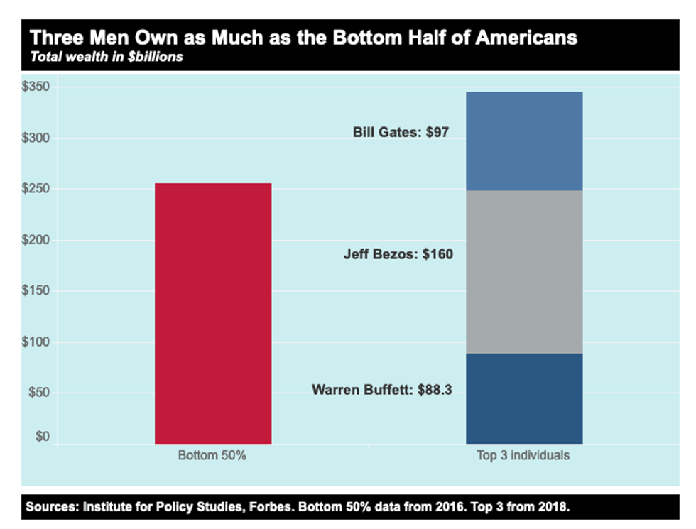 The wealthiest 3 billionaires in the U.S. - Jeff Bezos, Bill Gates and Warren Buffett -- now have as much wealth as the bottom half of the U.S. population combined.
